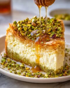 This decadent Baklava Pistachio Cheesecake combines the rich creaminess of classic cheesecake with the delightful crunch and sweetness of traditional baklava. Featuring a buttery pistachio crust, layers of crispy filo dough brushed with honey and lemon, and a smooth, honey-sweetened cream cheese filling, this dessert is a stunning fusion of Middle Eastern and Western flavors perfect for special occasions.