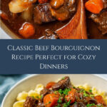 Classic French Beef Bourguignon is a rich, hearty stew featuring tender stewing beef slowly braised in red wine and beef broth with aromatic vegetables, bacon, and mushrooms. This comforting dish is perfect for a cozy dinner and pairs wonderfully with creamy mashed potatoes or noodles.