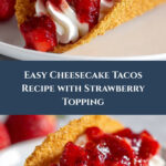 These delightful Cheesecake Tacos feature crisp graham cracker-coated tortilla shells filled with creamy cheesecake filling and topped with fresh strawberries and strawberry glaze, making a fun and delicious dessert perfect for any occasion.