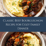 This Classic Beef Bourguignon recipe is a rich and hearty French stew featuring tender beef chuck slow-cooked in a bold red wine sauce with bacon, aromatic vegetables, mushrooms, and pearl onions. Perfect for a comforting meal that celebrates deep, savory flavors and traditional cooking techniques.