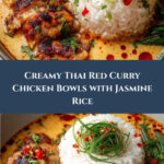 Creamy Thai Red Curry Chicken Bowls feature tender chicken thighs simmered in a rich and aromatic red curry sauce made with coconut milk, fresh herbs, and spices. Served over fluffy jasmine rice and topped with chili oil, spring onions, coriander, and lime wedges, this dish offers a perfect balance of spicy, tangy, and creamy flavors in a comforting bowl.