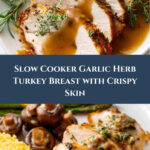 A flavorful and juicy slow-cooked garlic herb turkey breast recipe that yields tender meat infused with fresh herbs and garlic. Cooked low and slow in a slow cooker, then crisped under the broiler for a perfectly bronzed and crispy skin. Served with a rich homemade gravy made from the cooking juices, this recipe is perfect for a comforting family meal or holiday feast.