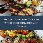 This Grilled California Avocado Chicken recipe features juicy marinated chicken breasts grilled to perfection and topped with creamy avocado, fresh cherry tomatoes, and melted cheese for a flavorful and satisfying meal.